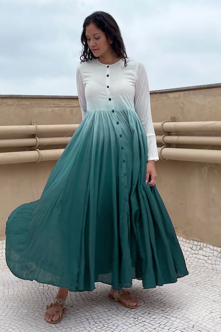 Sage green cotton ombre flared dress with a buttoned front placket.