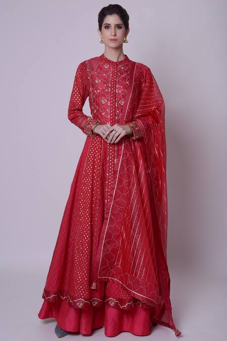 Red anarkali with embroidered floral motif work all over. Paired with skirt & dupatta