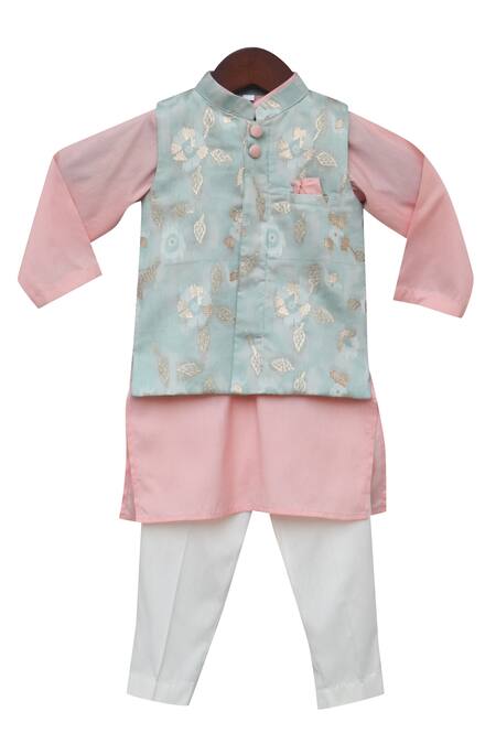 Blue bundi with all over floral motif detail. Comes with pink kurta & off white pants.