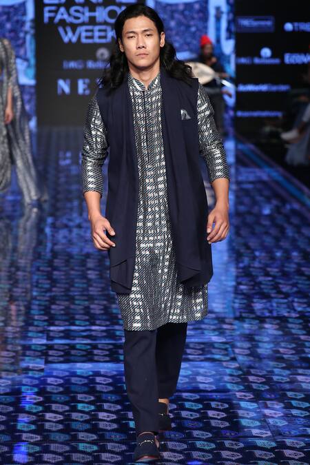 Blue straight kurta with printed motifs & zari embroidery paired with denim shawl collar Nehru jacket. Comes with denim pants.