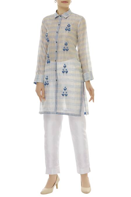 White Woven Chanderi Shirt Collar Checkered Tunic