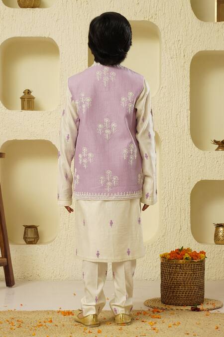 Lilac chanderi jacket featuring quilted base with dori embroidery. Paired with ivory embroidered kurta and pant.