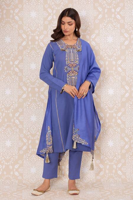 Royal blue chanderi dupatta with floral embroidered motifs & metal sequin detailing.