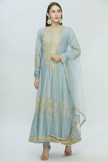 Powder blue anarkali with placement floral motifs. Comes with churidar pants & dupatta.