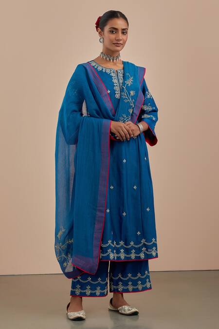 Blue chanderi dupatta with floral embroidery & contrast hem.