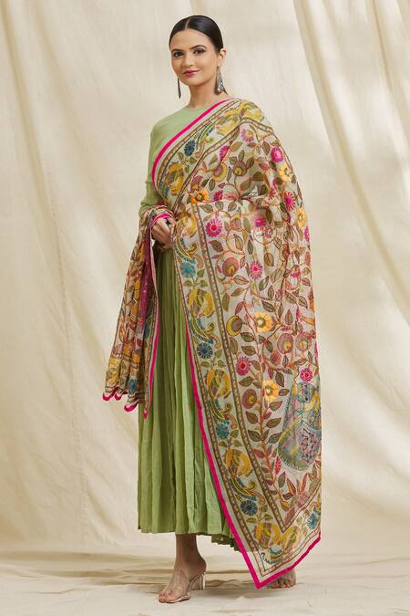 Off White Chanderi Figurine Pattern Phulkari Dupatta