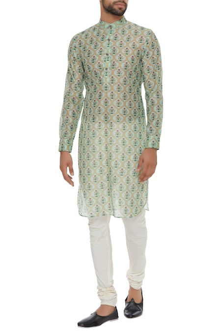 Buy_Pranay Baidya_Green Chanderi Floral Printed Classic Kurta_at_Aza_Fashions
