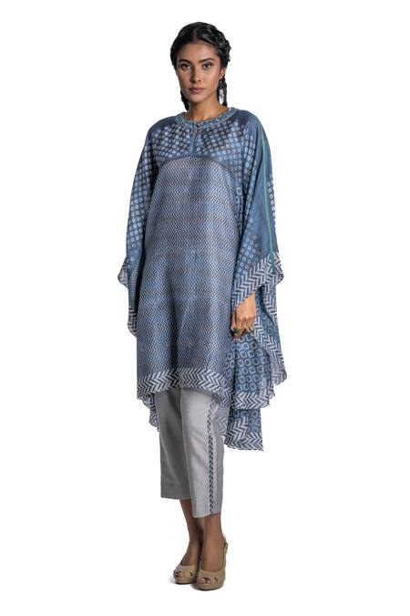 Blue asymmetric chanderi kaftan with all-over block print and hand embroidery on the neckline. Comes with straight pants.