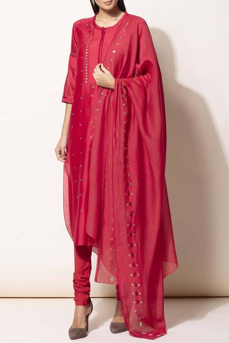 Red straight kurta with all over embroidered motifs. Comes with churidar & dupatta.