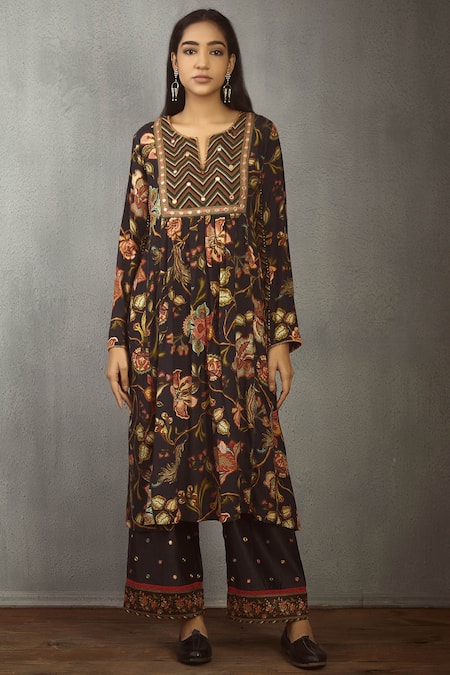 Black kurta with all-over floral motif work. Comes with straight pants.