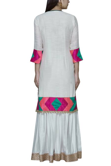 Ivory kurta with embellished detail & geometric patchwork. Comes with sharara and dupatta.