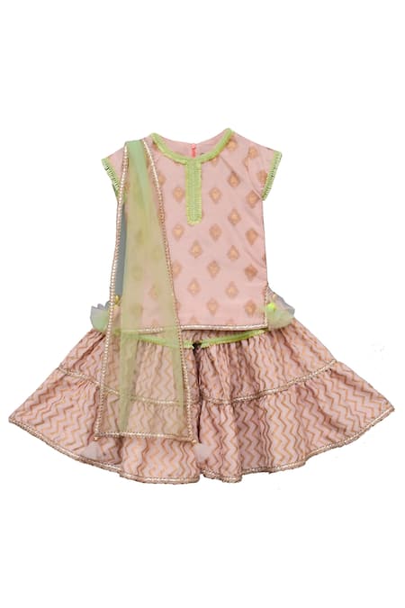 Peach kurta with all-over baroque motif prints. Comes with tiered sharara pants & tassel border dupatta.