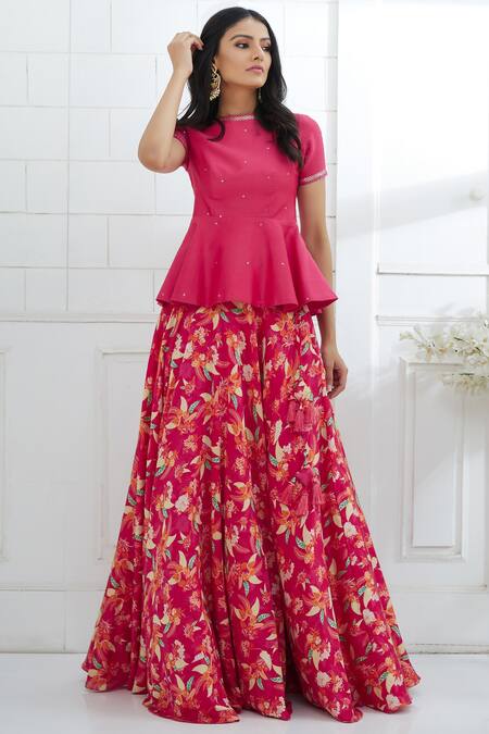 Pink peplum top with all-over sequin work. Comes with floral printed lehenga.