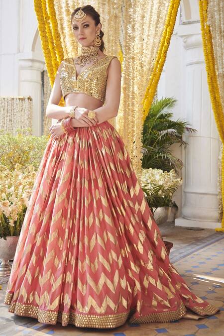 All over mirror worked cutout back gold blouse. Comes with coral pink foil print lehenga.