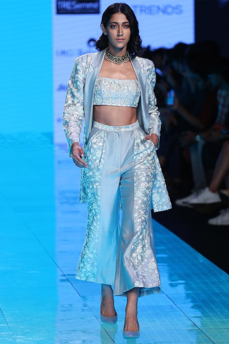 Blue blazer with all-over floral motif bead & pearl work paired with embroidered bell bottom pants. This set comes with embellished crop top.
