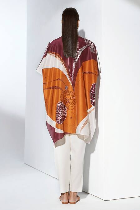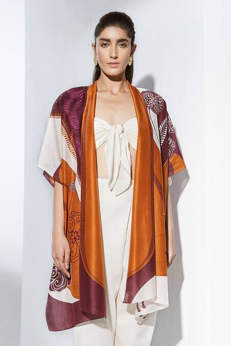 Tan chanderi printed cape with printed floral and leaves motifs.