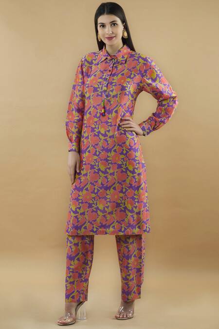Purple straight kurta with all-over floral motif prints. Comes with straight pants.