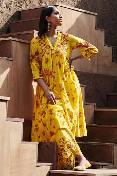 Yellow Kurta Chanderi Pant Cotton Embroidery V Neck Printed Set