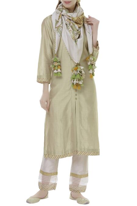 Printed , Bordered Scarf , Tassel Latkan Detail, Note: Kurta & pants worn by the model is not for sale