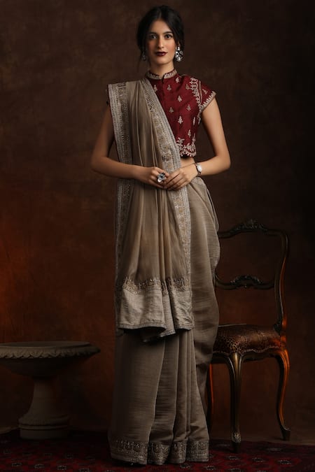 Beige saree with placement floral motif work & striped detail. Comes with maroon embellished blouse.