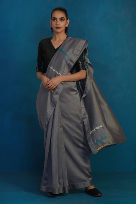 Grey saree with embroidered pallu. Paired with embroidered V-neck blouse.