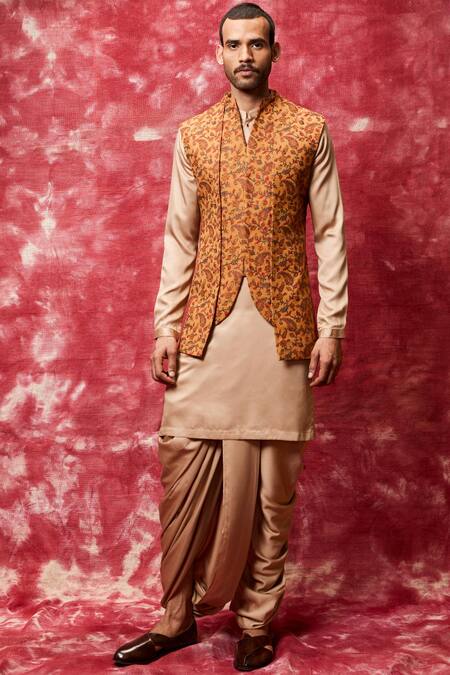 Mustard bundi with embroidered paisley motifs & front panel detail. Comes with gold straight kurta & draped pants.