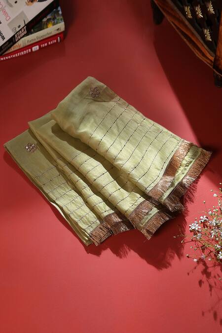 Lime green chanderi silk dupatta featuring intricate gota and floral buttis embroidery