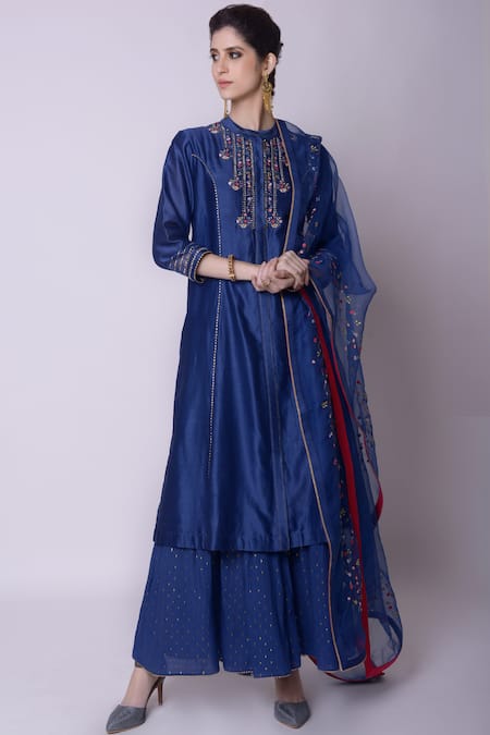 Buy_5x By Ajit Kumar_Blue Chanderi Silk Kurta Palazzo Set_Online_at_Aza_Fashions