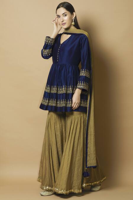 Blue peplum-style kurta with floral embroidery. Comes with contrast sharara pants & dupatta.