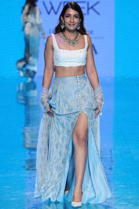 Blue maxi skirt with knife pleats, thigh-high slit & all-over Mughal motif bead work. Comes with cutwork border dupatta & embellished ivory crop top.