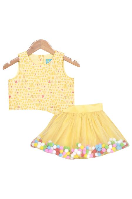 Yellow all-over geometric motif printed top. Comes with matching pom pom balls inserted balloon skirt.