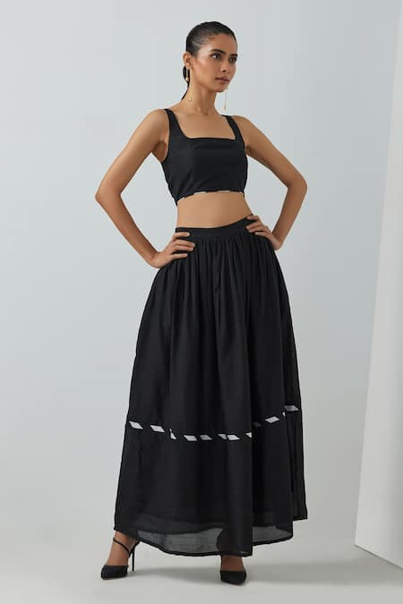 Black sleeveless cropped bralette made from chanderi fabric featuring white piping detailing. Paired with a matching skirt with zebra pattern piping and an elasticated waistband.