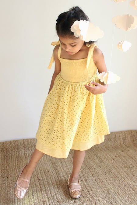 Smocking work at the bodice, Schiffli pattern throughout the fabric