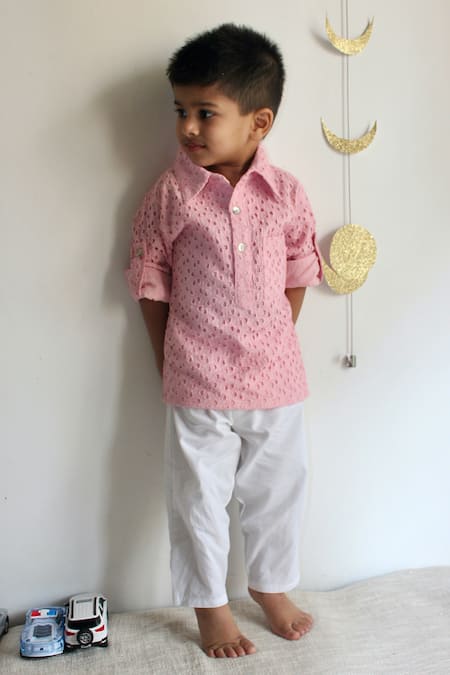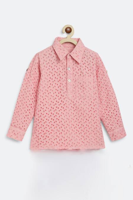 Pink kurta featuring all-over schiffli embroidery and a collared neck