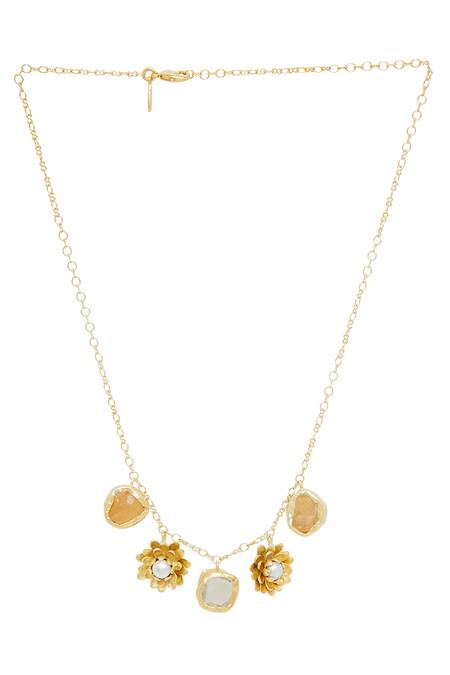 Gold plated necklace featuring floral pendants embellished with stones and beads