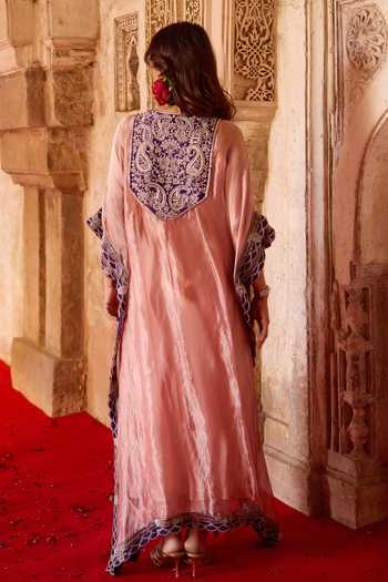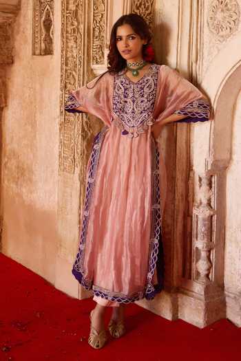 Pink Silk, Organza, Tissue, Tussar, Tavleen Paisley Embroidered Kaftan Set