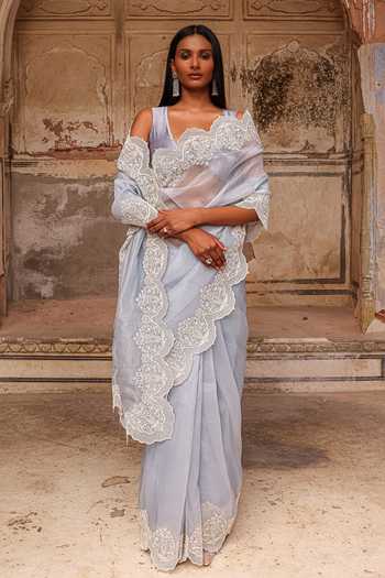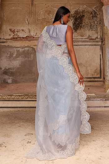 Ice blue Ayesha saree in organza with white dori work, offering a light graceful drape. Paired with a silk blouse piece.