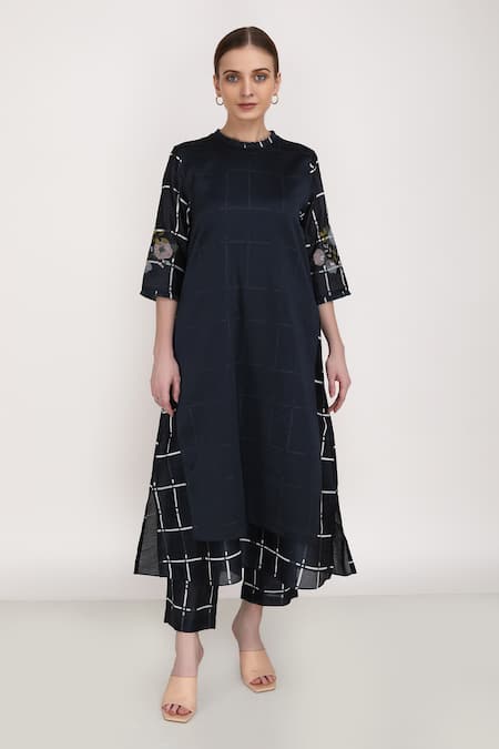Indigo kurta with checkered & floral pattern. Paired with pant.