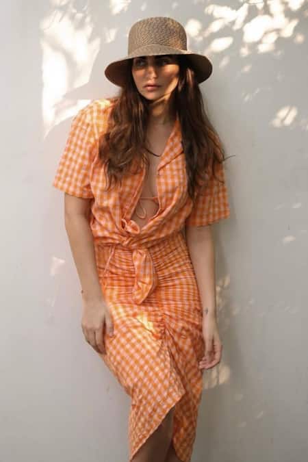 Orange shirt with checkered pattern & lapel collared neckline.