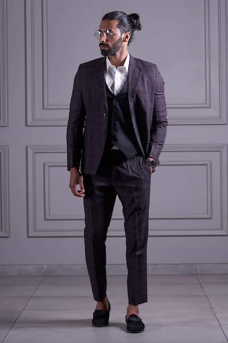 Brown suit with red checkered pattern. Paired with black waistcoat & pant.