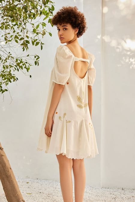 Cream dress in mulmul cotton featuring a square neckline and half puffed sleeves