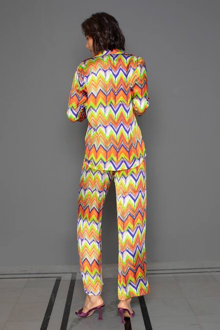 Orange chevron print shirt with no buttons blazer collar and folded cuff sleeves in cotton silk fabric.