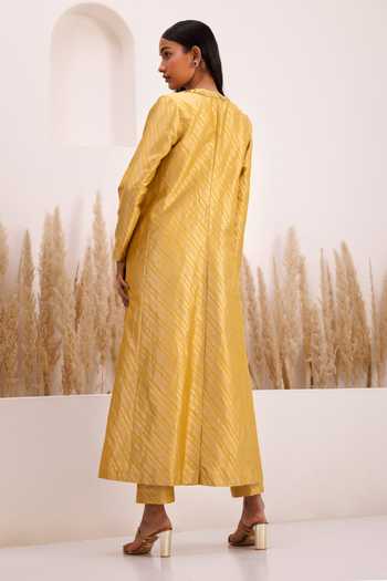 Yellow brocade long jacket featuring embellishments and a cowl neck top. Paired with matching brocade pants.