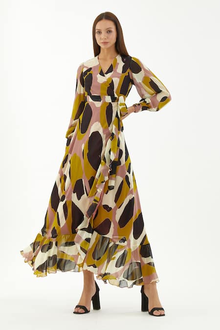 Peach, white, black and mustard wrap dress in chiffon base with all over abstract pattern.