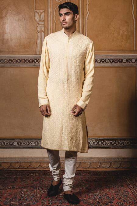 Yellow kurta with all over chikankari embroidery. Comes with white churidar.