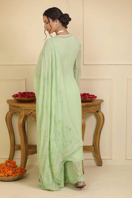 Mint green kurta featuring floral pattern chikankari thread embroidery and full sleeves. Paired with embroidered flared pant and embellished dupatta.