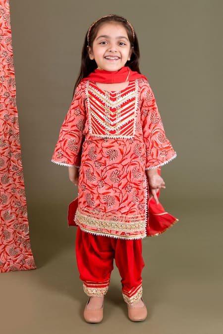 Orange kurta featuring all-over block printed floral motifs with gota detailing. Paired with a matching salwar and dupatta.