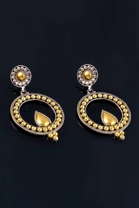 Gold plated handcrafted drop earrings in silver base with round motifs & tear drop detail.