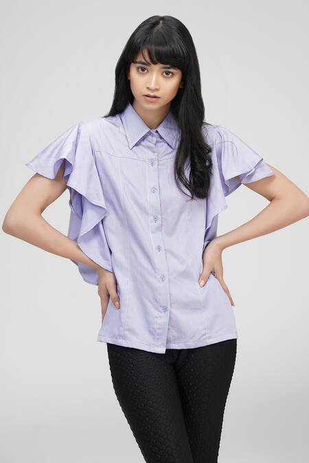 Lavender shirt featuring circular ruffle sleeves and a spread collar
