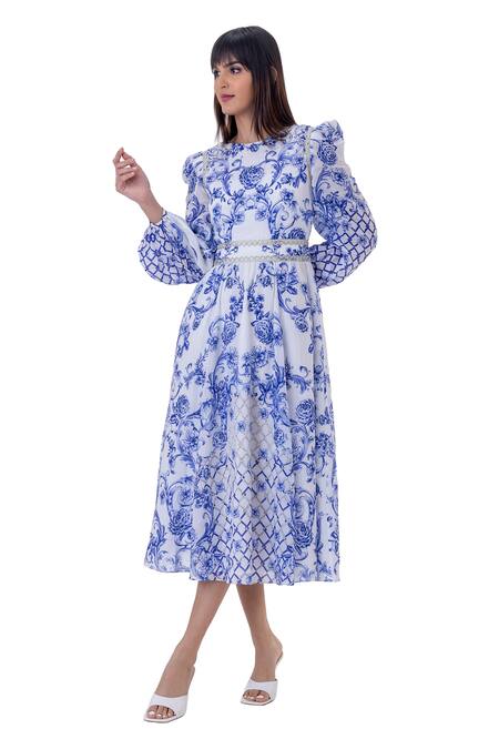 White, blue linen fit & flare dress with all over baroque print, round neck, bishop sleeves & placement metallic crochet embroidered highlights.